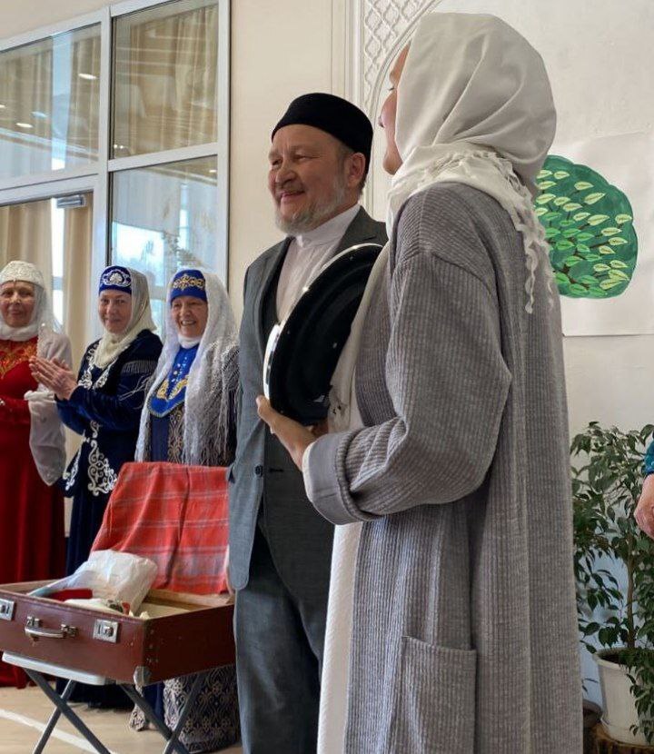 Әхмәт хәзрәт милли һәм дини тәрбиянең әһәмияте турында сөйләде, «Сабыйлар» үзәге җитәкчелегенә, укытучыларына, барлык хезмәткәрләргә олуг рәхмәтен җиткерде һәм «Апанай» мәчете рәсеме ясалган сәгать бүләк итте.