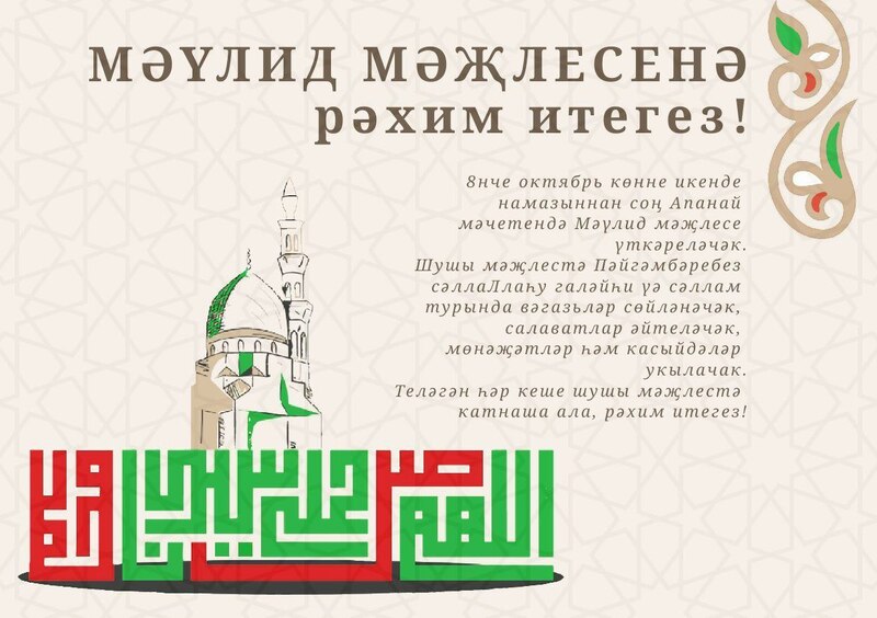 8нче октябрь көнне икенде намазыннан соң Апанай мәчетендә Мәүлид мәҗлесе үткәреләчәк.